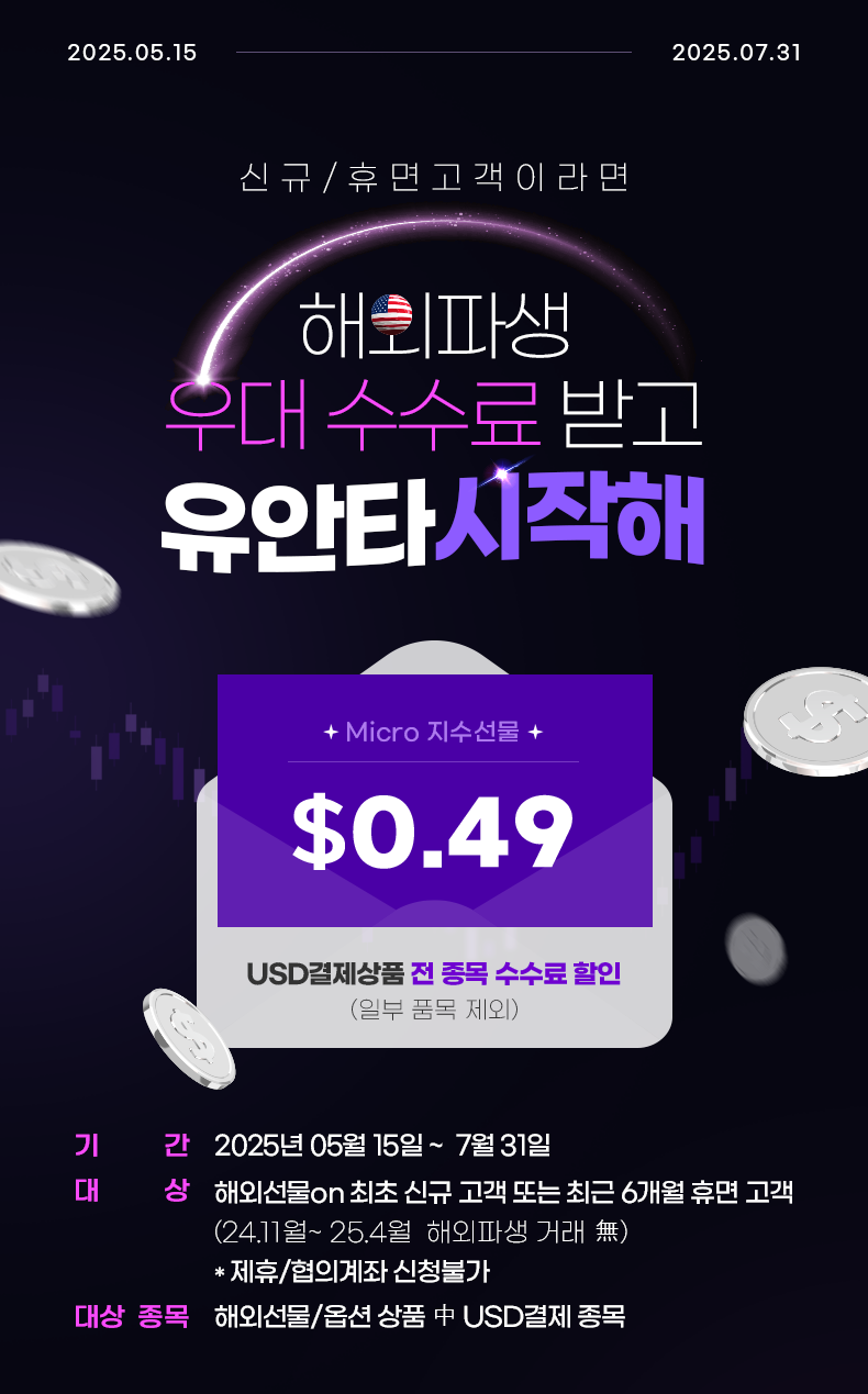 Micro 지수선물 $0.49 USD결제상품 전 종목 수수료 할인 (일부품목 제외)