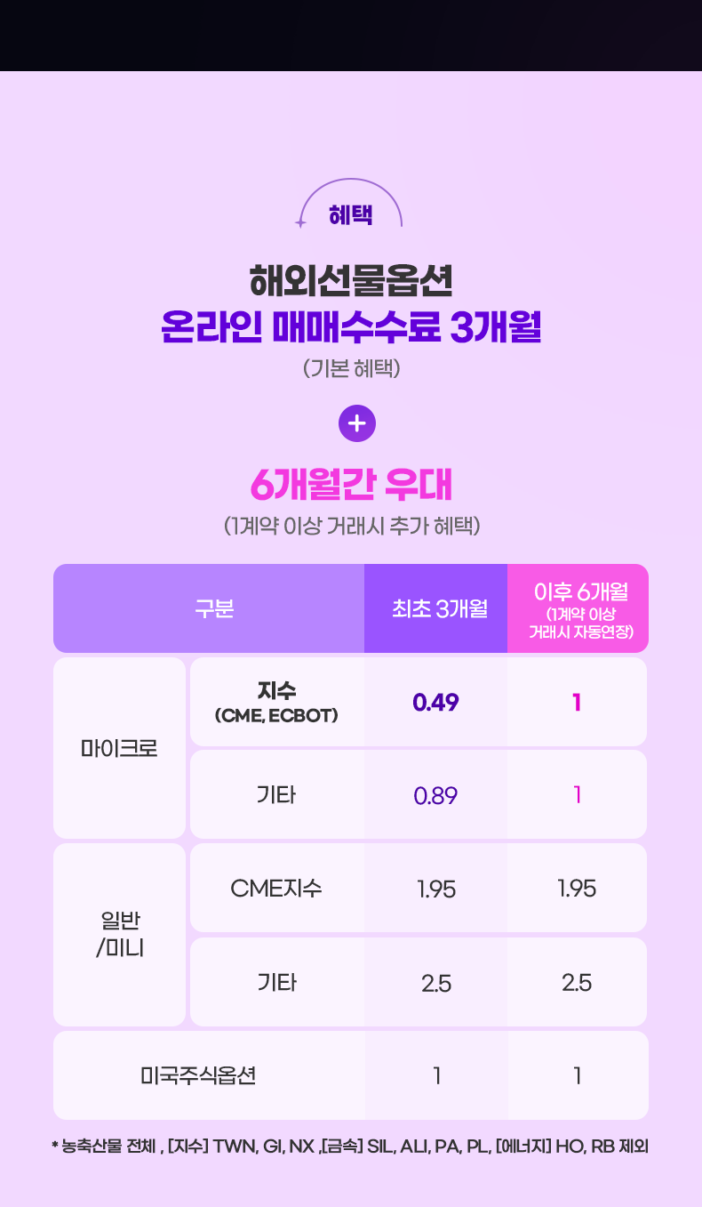 해외선물옵션 온라인 매매수수료 3개월 (기본 혜택) + 6개월간 우대 (1계약 이상 거래시 추가 혜택)