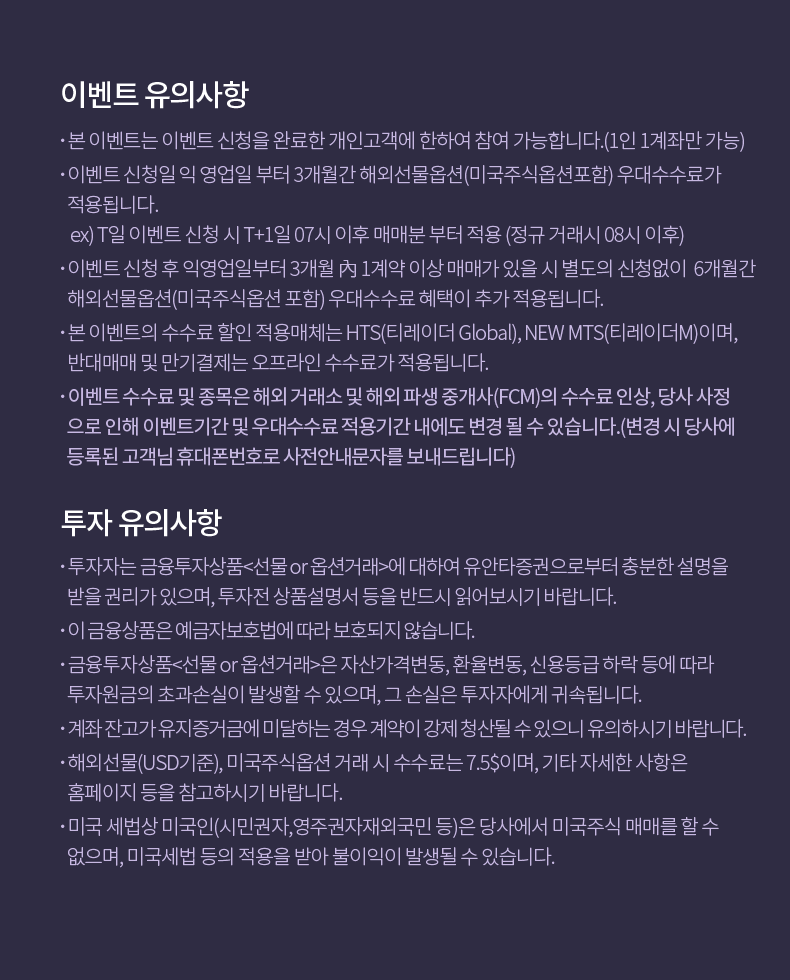 - 본 이벤트의 수수료 할인 적용매체는 HTS(티레이더 Global), NEW MTS(티레이더M)이며, 반대매매 및 만기결제는 오프라인 수수료가 적용됩니다.