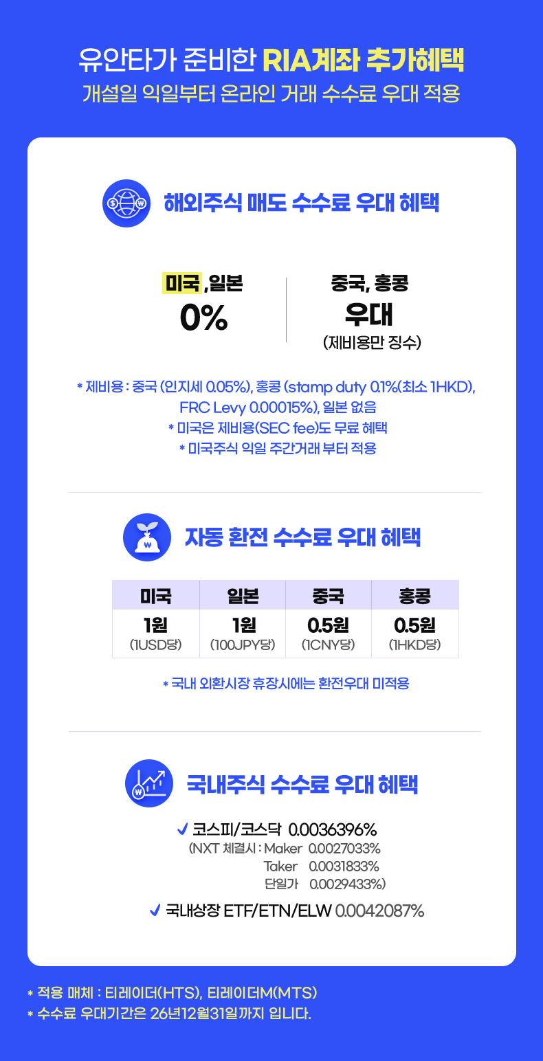 - 해외주식 매도시 제비용이 별도 부과됩니다. [상해A/심천A 0.05%, 홍콩 Stamp Duty 0.1%(최소 1HKD)&FRC Levy 0.00015%(소수점 셋째자리에서 반올림하여 최소 0.01HKD), 대만 0.3%(Day Trading 0.15%/ETF 0.1%), 2026년 4월 2일부터 미국 SEC fee 0.00206%, 일본은 제비용 없음] 단, 미국주식은 당사가 정한 기준에 따라 RIA계좌에서 매도 시 미국주식 제비용 무료 혜택이 적용됩니다.