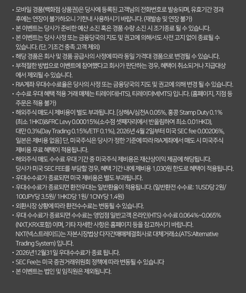 - 해외주식 매도 수수료 우대 기간 중 미국주식 제비용은 재산상이익 제공에 해당됩니다. 당사가 미국 SEC FEE를 부담할 경우, 혜택 기간 내에 제비용 1,030원 한도로 혜택이 적용됩니다.